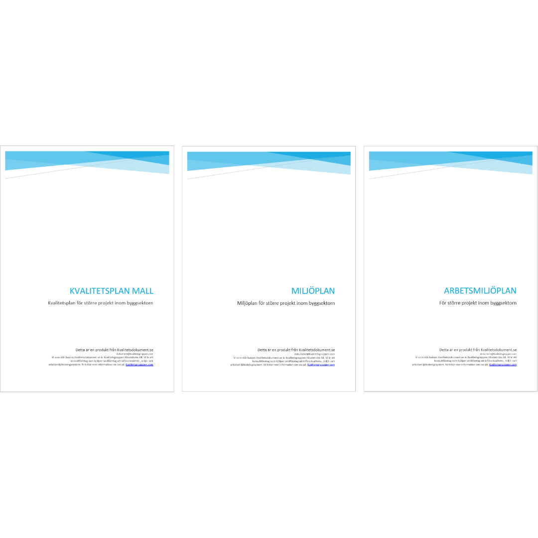 Prisvärt paket med tre praktiska och beprövade mallar för kvalitetsplan, miljöplan och arbetsmiljöplan – anpassade för större bygg- och entreprenadprojekt.